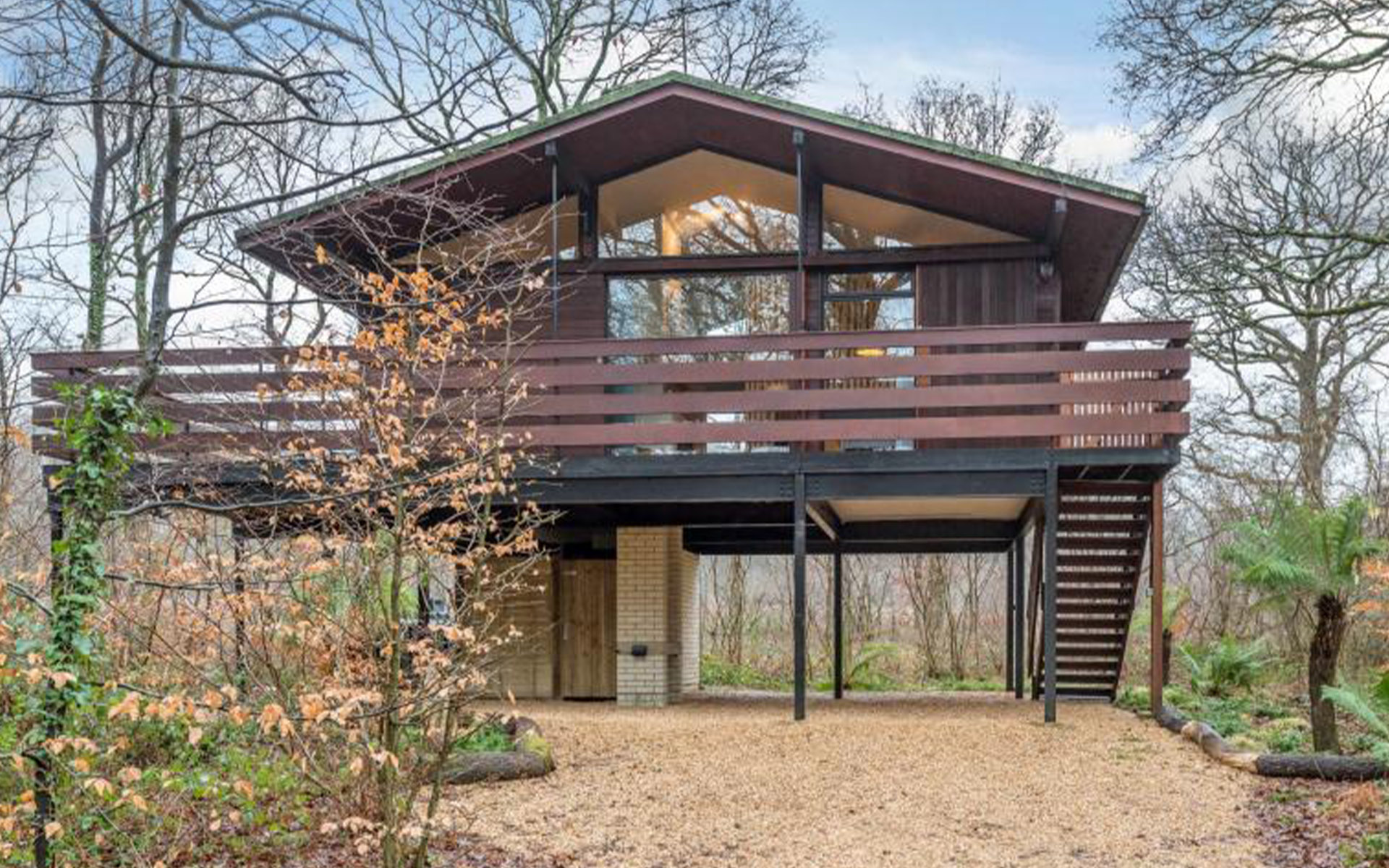 A striking stilt house set in a leafy and tranquil position moments from Beaulieu River, benefits from a wood burner for those cosy nights in and beautiful surroundings.