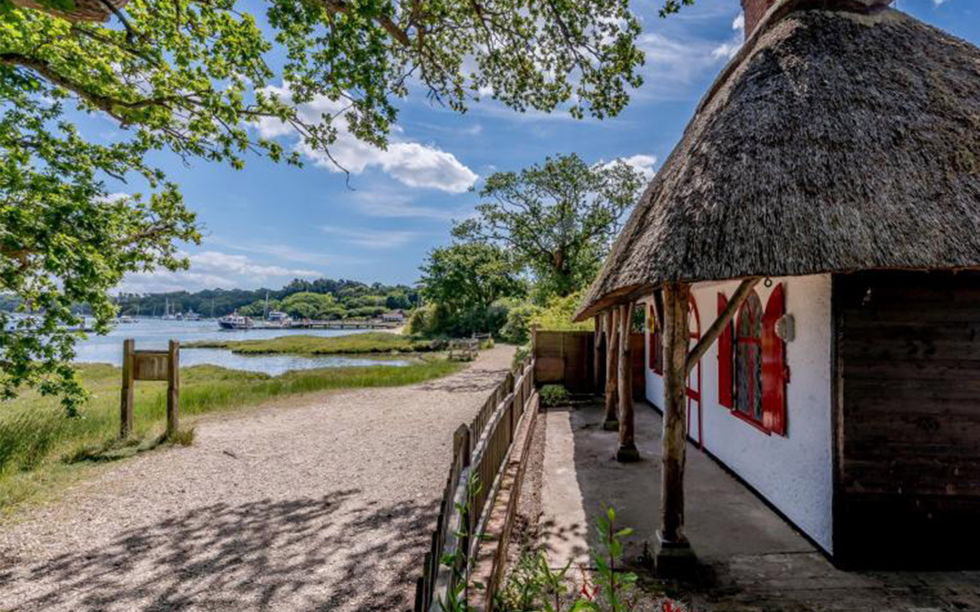 A unique Grade II listed former bath house with thatched roof and rustic tree trunk veranda, set in an idyllic location beside the Beaulieu River.
